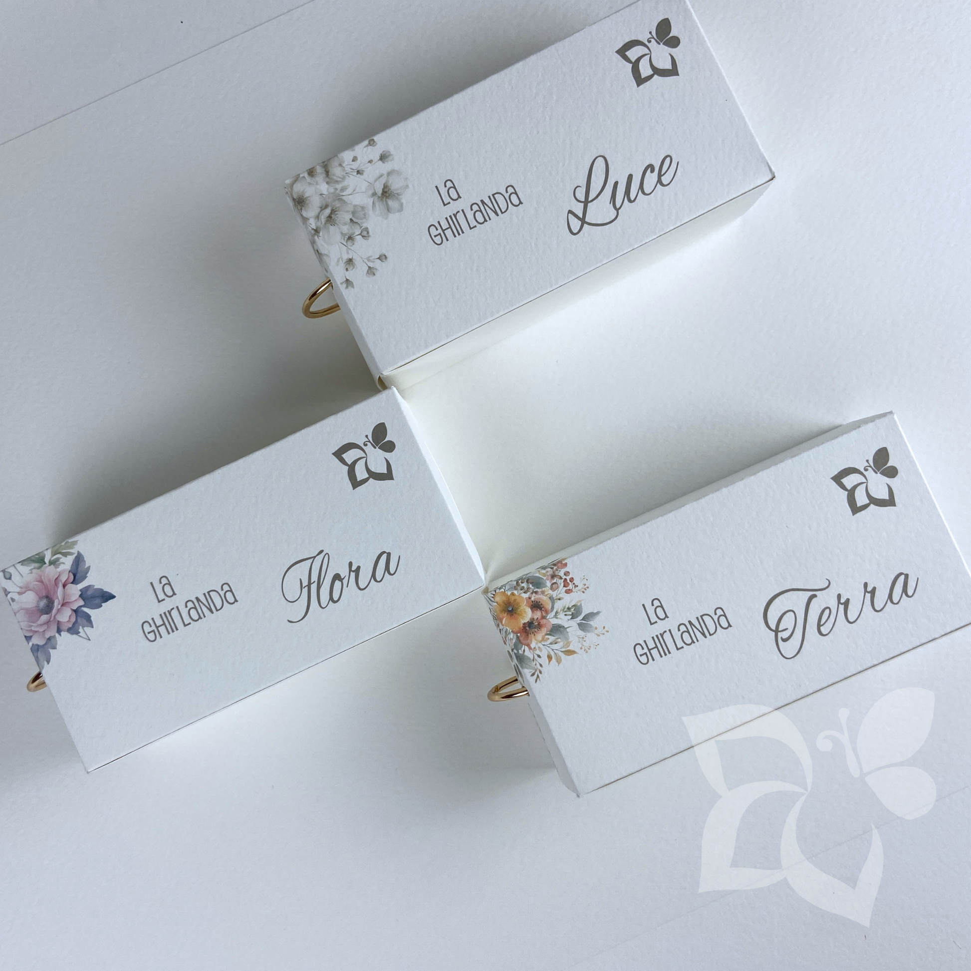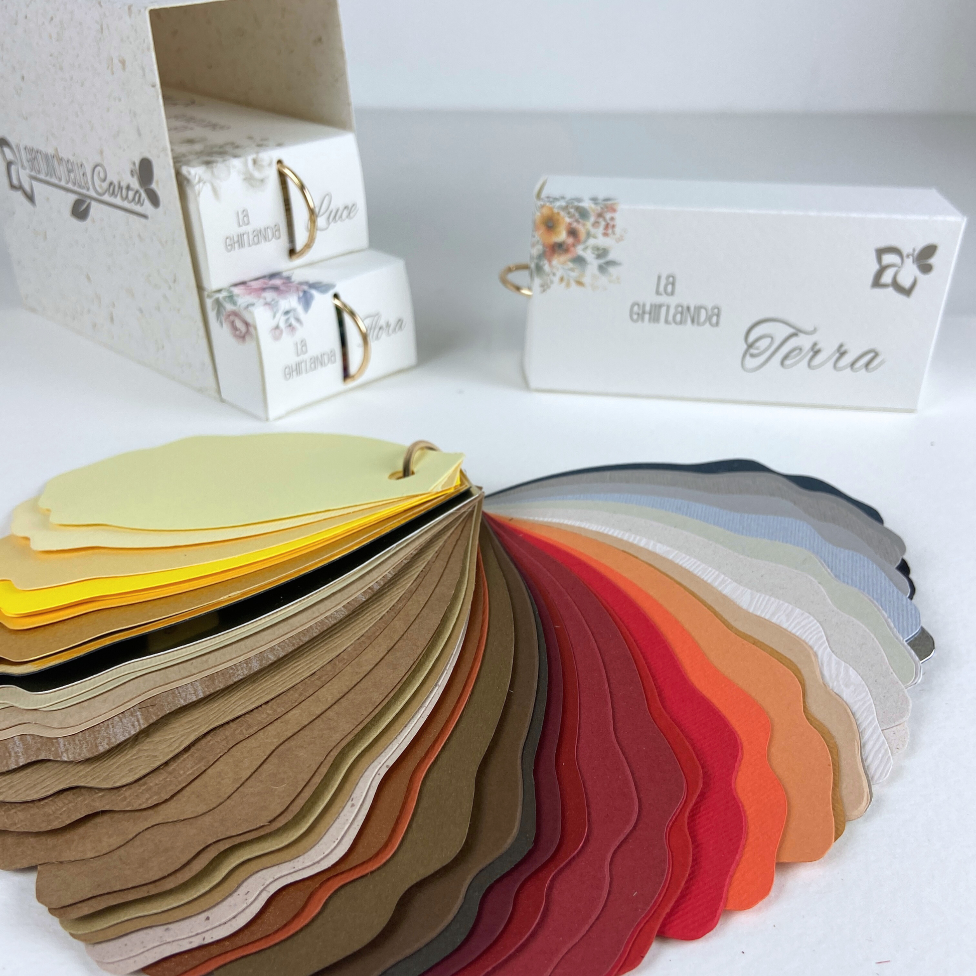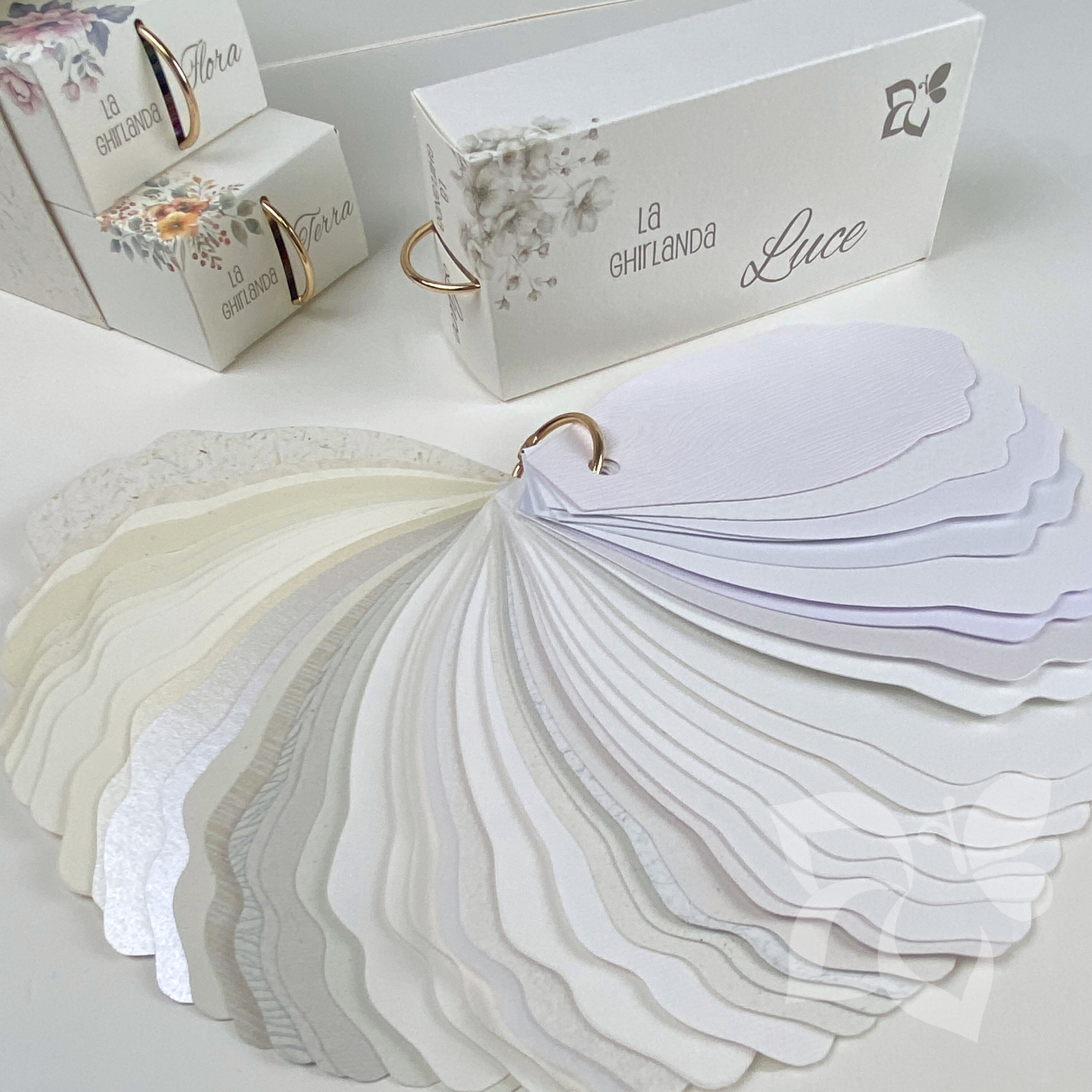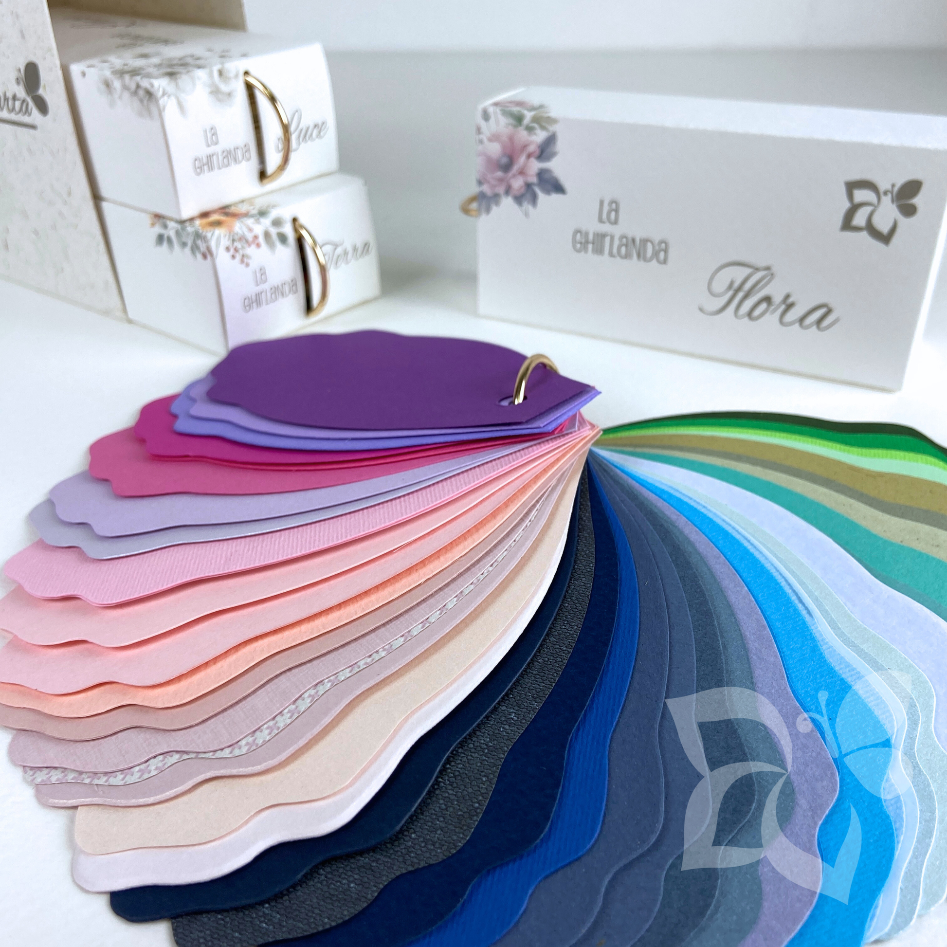 Il nostro campionario riunisce 160 carte divise in tre ghirlande: Luce, Terra e Flora.