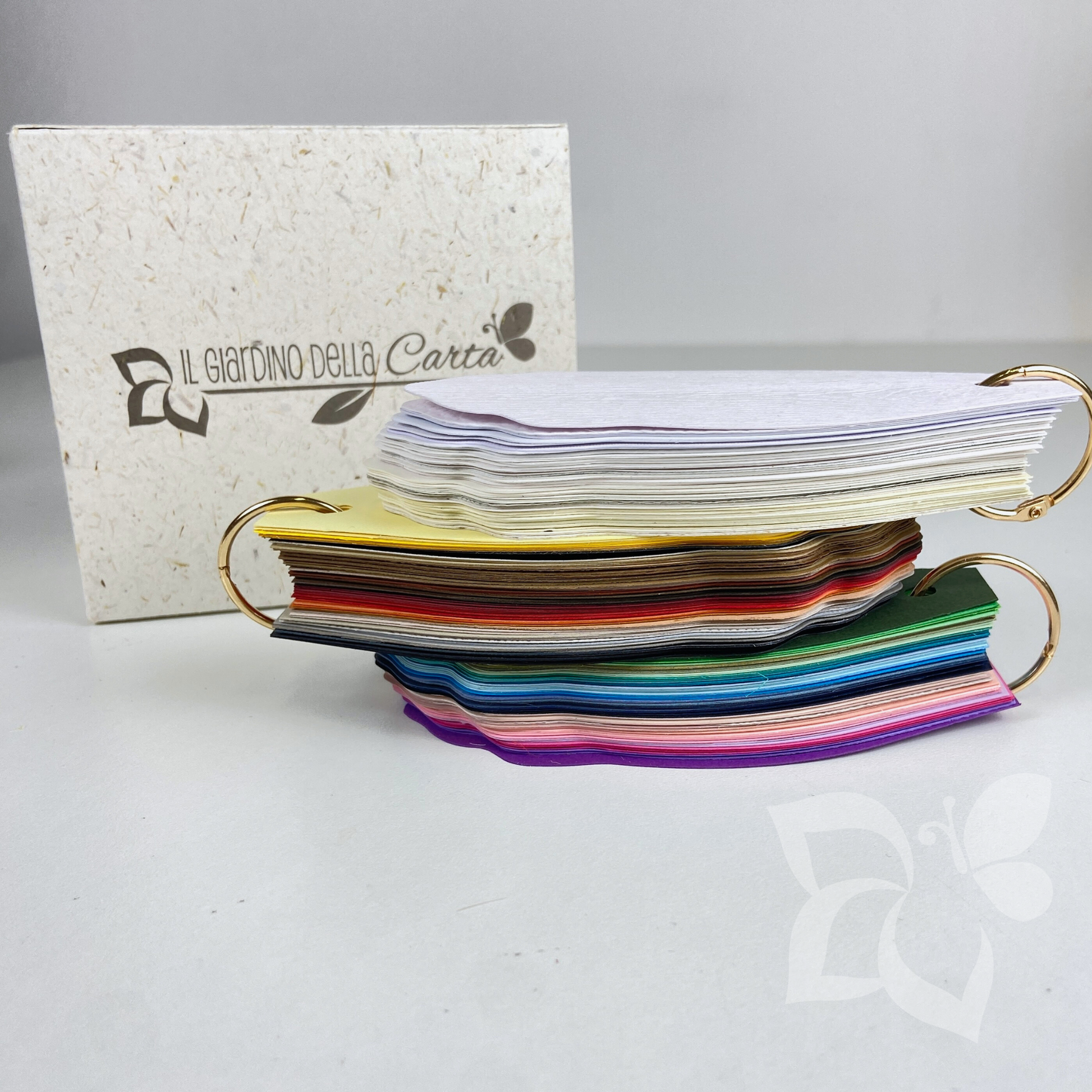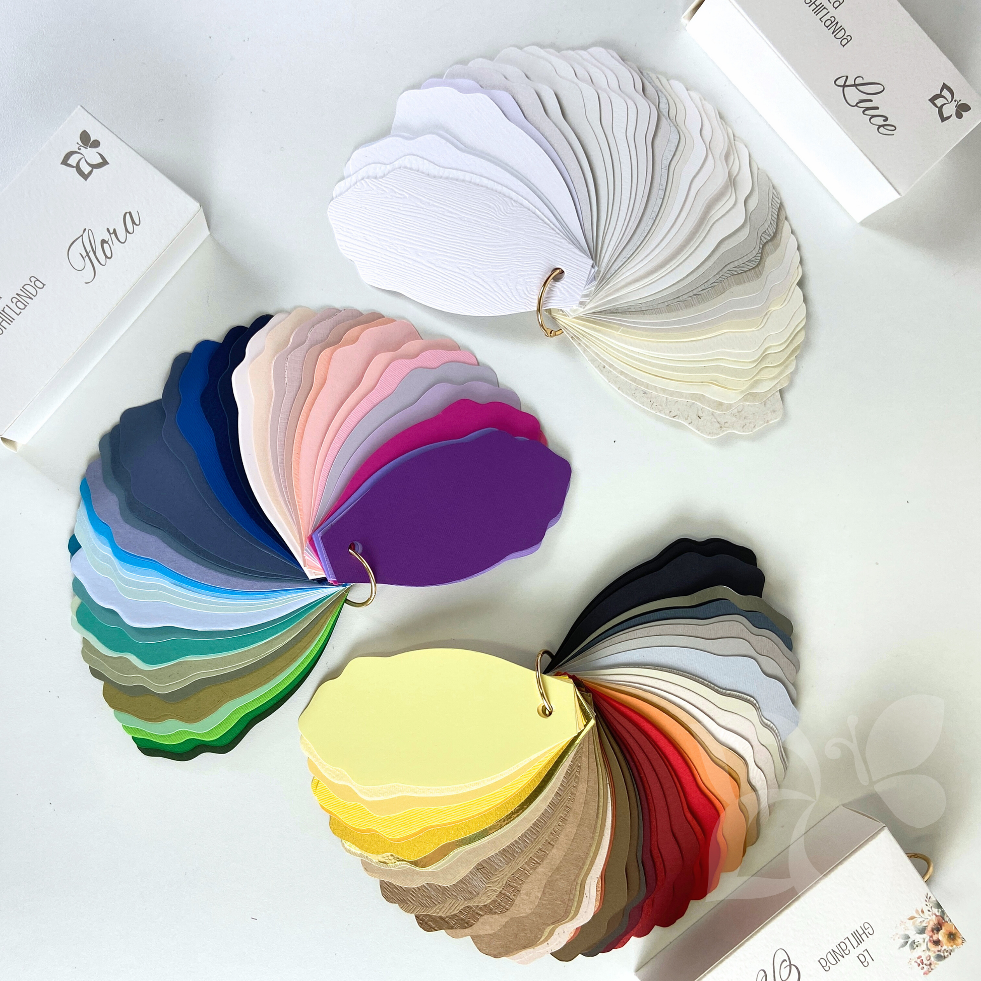 Di seguito troverai le carte che danno vita al campionario, raccolte nelle tre ghirlande e in ordine di cromia.