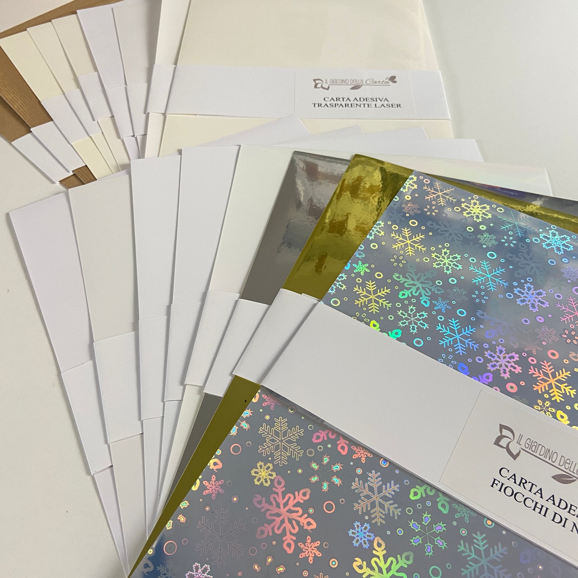 Il set contiene 17 tipologie di carte adesive in formato A4, e per ogni tipologia sono inclusi 2 fogli, perfetti per test, campionatura e lavorazioni più strutturate.